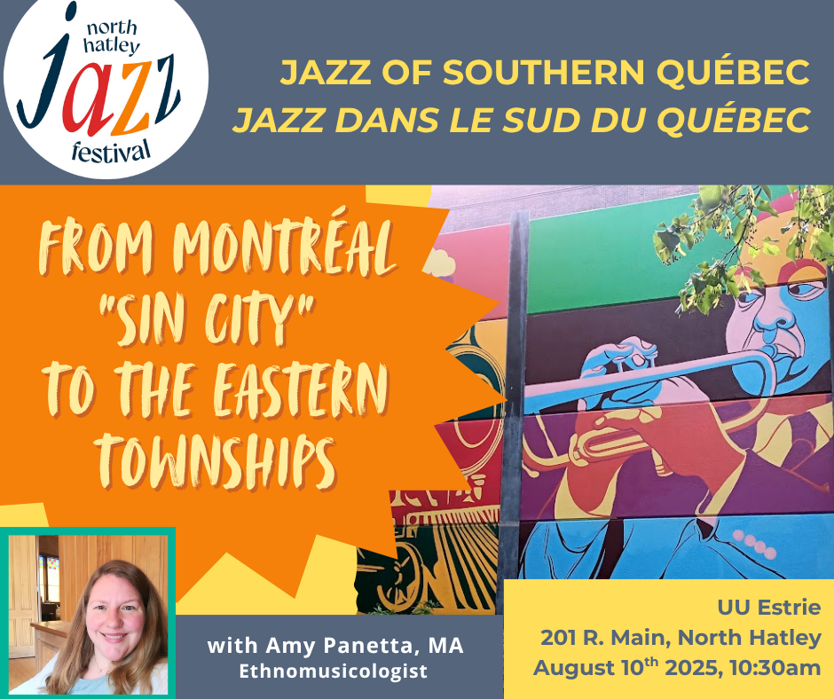 Join us to explore the rich history of jazz in Southern Quebec. Born in New Orleans and nurtured along train routes, jazz took hold in Montréal, Canada's jazz capital. From … Continue reading "Aug 10th, 10:30 a.m. UU Estrie & The North Hatley Jazz Fest “From Montréal “Sin City” to the Eastern Townships” – with Amy Panetta, MA, Ethnomusicologist"